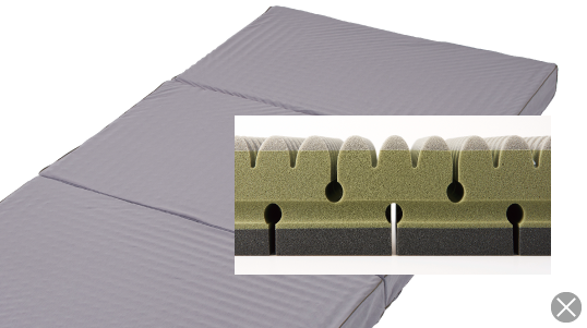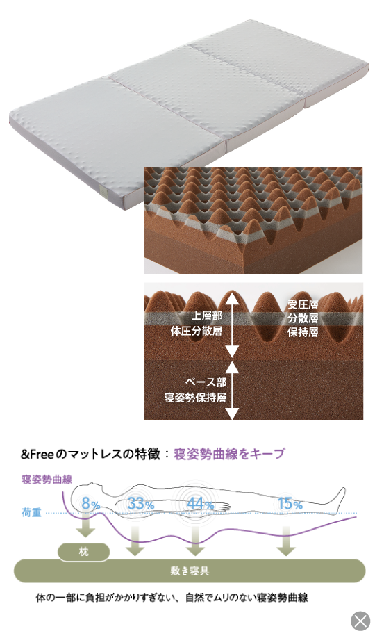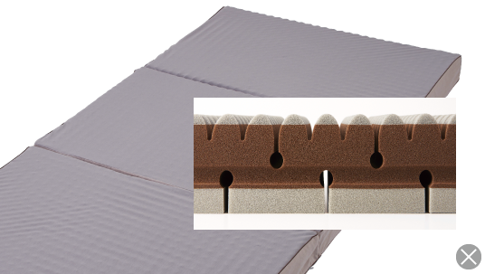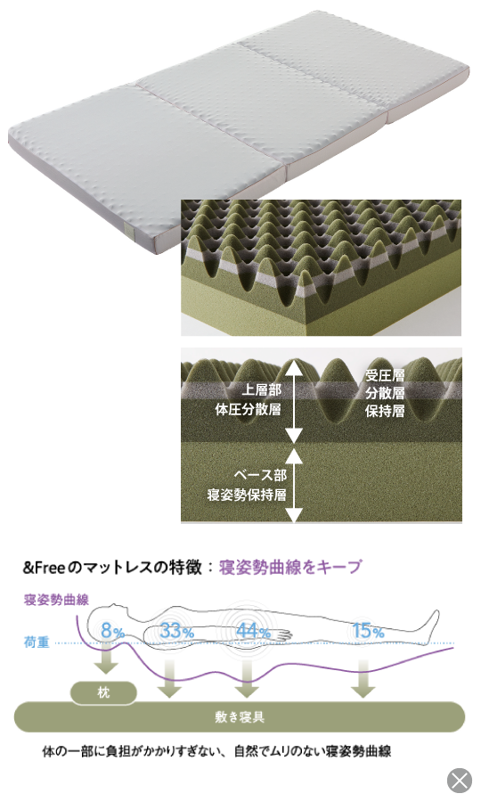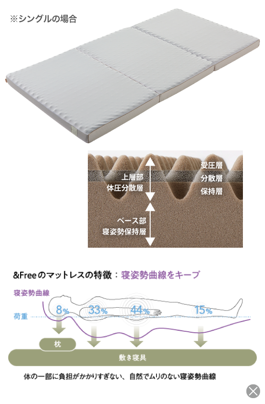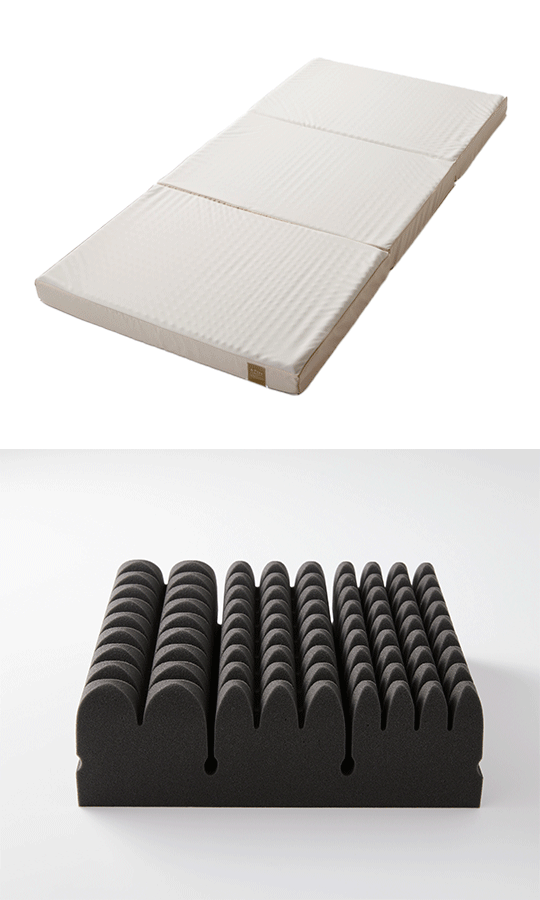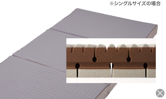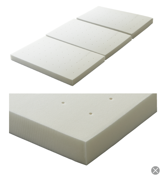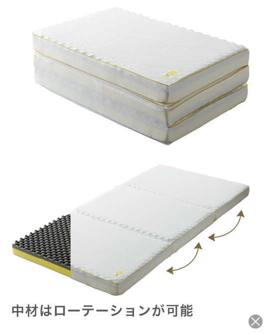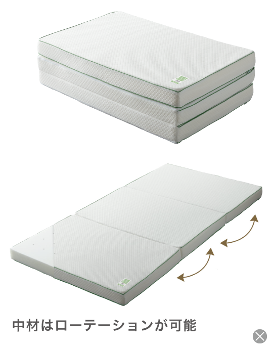 三ツ折タイプで楽々上げ下ろし! 体重が一番かかる真ん中部分のウレタン を前後で入れ替えることによりマットレ スがさらに長持ち。